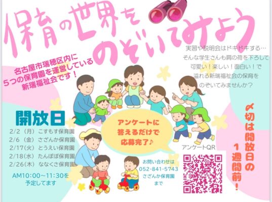 お知らせ 2026年1月27日 セレクト とうえい保育園 地域開放中止のお知らせ 2026年1月14日 セレクト たんぽぽ保育園 リフレッシュ保育新規申し込みのお知らせ(26年3月分) 2026年1月9日 セレクト ★大学生・専門学生の方へ★保育園を見にきませんか? 2026年1月9日 セレクト たんぽぽ保育園 1月の地域開放のお知らせ もっと読む 施設一覧 たんぽぽ保育園 児童発達支援たんぽぽ こすもす保育園 さざんか保育園 ななくさ保育園 とうえい保育園 あさがお学童保育所 放課後等デイサービスあさがお 障害児相談支援事業所あさがお 採用情報 職員募集! 私たちといっしょに子どもたちの成長を見守りませんか? 園児も保護者も職員もなかよく安心して働ける職場です。家庭的な保育環境のなか、園児の笑顔と笑い声とともに働いています。子どもが大好きで、元気で明るい方、お待ちしています。 詳しくはこちら 特別事業 新瑞福祉会は、特別保育事業にも取り組んでいます 地域子育て支援センター 地域全体で子育て家庭を支援するため、親子の交流の場を提供しています。子育て家庭の様々なお困りごともご相談ください。 詳しくはこちら 一時保育 保護者の方が就労、通院、就学、介護などにより、家庭での保育が一時的に困難な場合にお預かりします。買い物や美容院など、保護者のリフレッシュにもご利用いただけます。 詳しくはこちら 休日保育 市内の認可保育所、認定子ども園、家庭的保育事業所、小規模保育事業所を利用している2号認定または3号認定をうけたお子さんで、保育の必要性がある場合にお預かりします。 詳しくはこちら 緊急一時保育 保護者の方の就労、入院・通院、冠婚葬祭、介護などにより、家庭での保育が緊急・一時的に困難な場合にお預かりします。夜間・宿泊も含め、24時間365日対応します。 詳しくはこちら