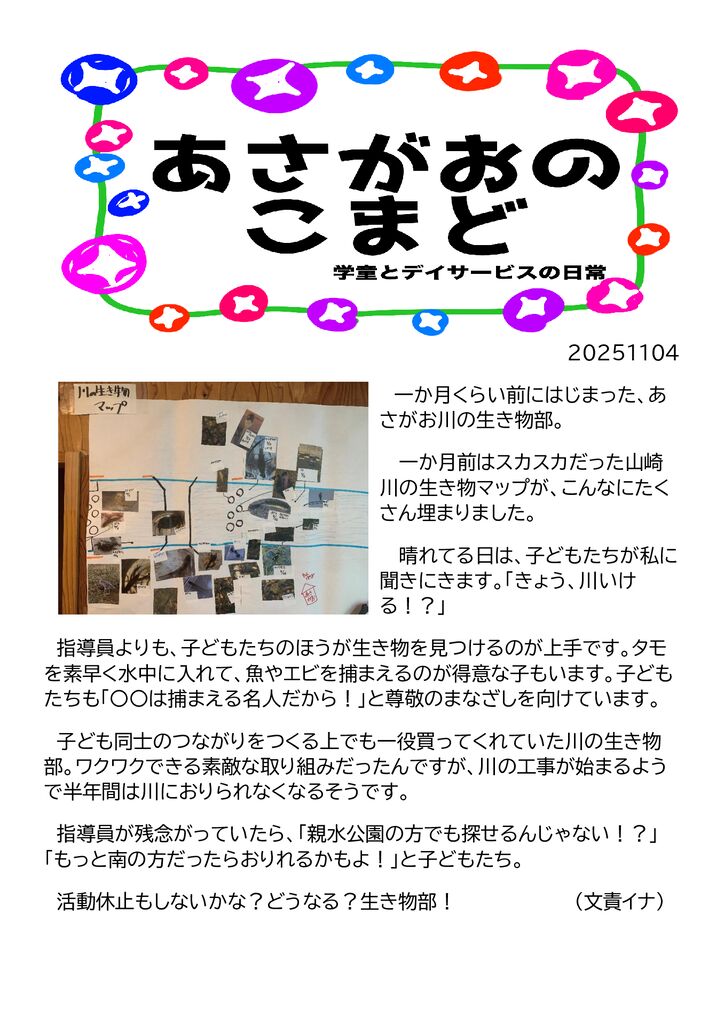 川の生き物部活動休止か
