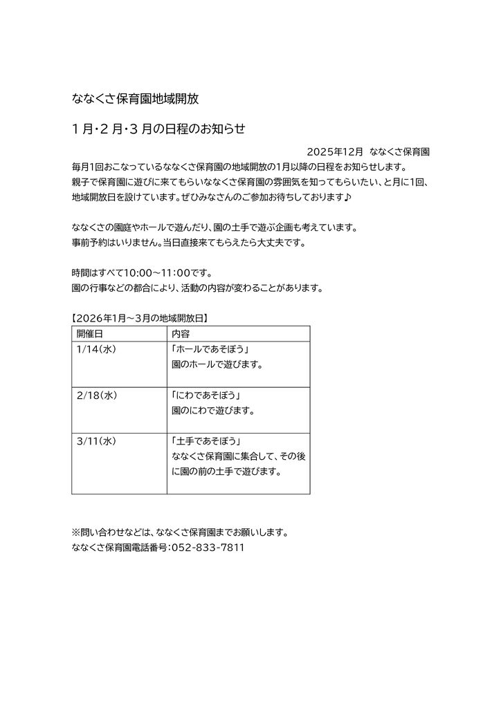ななくさ保育園地域開放日のお知らせ(2026年1月~3月)